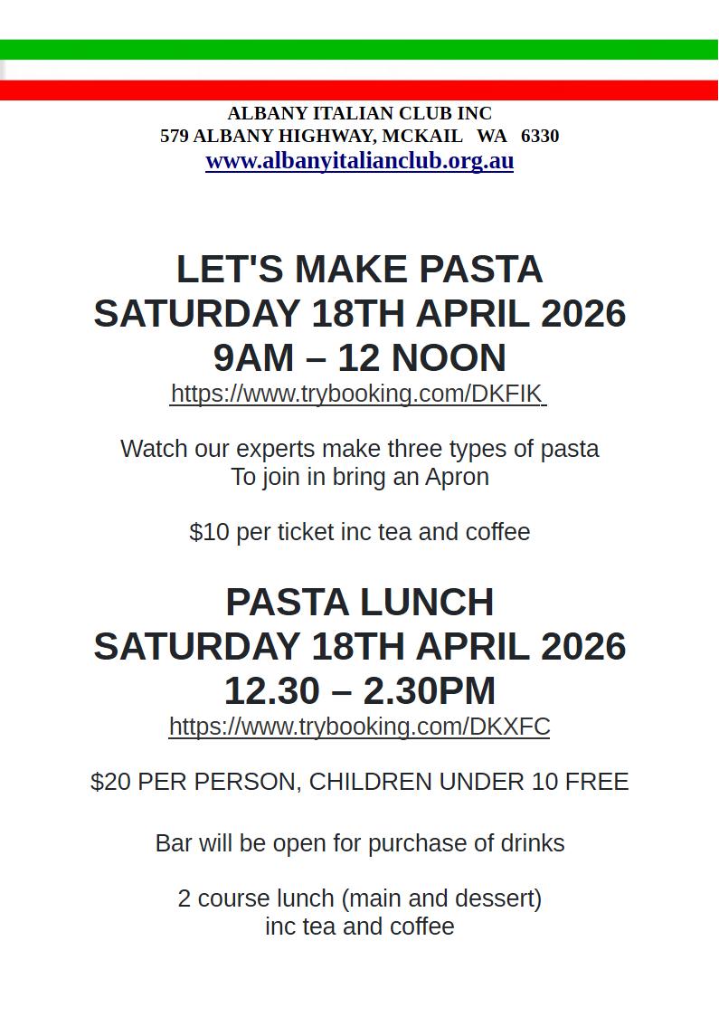 18th of April 2026. Starting 9am – 12 noon. You can stay for lunch for $20 and eat the pasta that you just made.